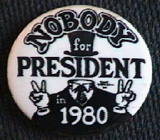 The Birthday Party's Nobody for President Campaign is a humorous approach to elections designed to encourage people to register and vote for the candidate of their choice. Nobody is NOT an endorsement of apathy. Apathy Sucks, Nobody for President!